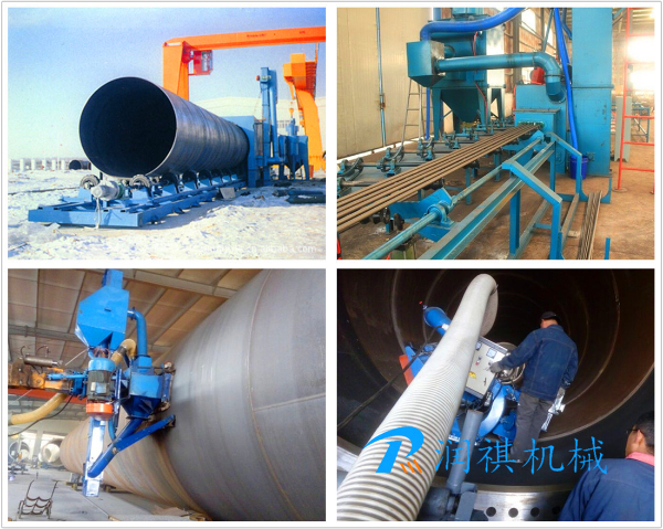 彈丸流束擊碎鋼管內(nèi)表面上的氧化皮、銹層及其雜物,使之獲得精細(xì)的光亮表面,提高工件的抗拉和抗壓強(qiáng)度,為內(nèi)表面涂漆保護(hù)增加附著力,達(dá)到防腐、護(hù)管、延長(zhǎng)鋼管使用壽命之目的。清理